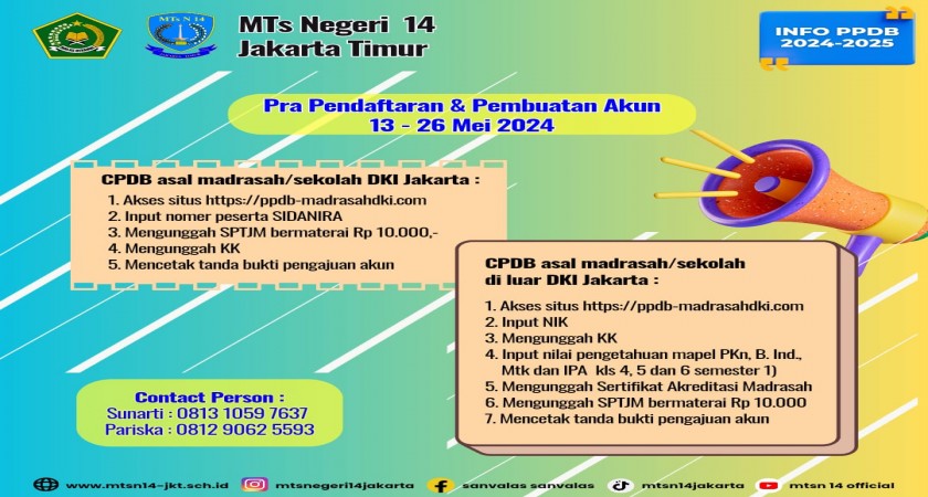 Siap-siap ya #sobat14 ... jangan lupa hari Senin, 13 Mei 2024 sudah mulai membuat akun untuk Penerimaan Peserta Didik Baru (PPBD) tahun pelajaran 2024-2025. Simak dan persiapkan berkas persyaratan nya.